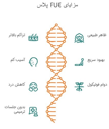 برخی مراکز، برای افزایش ماندگاری و کیفیت نتایج، از تکنولوژی های مکمل مانند لیزر جهت طراحی خط رویش یا آنالیز پوست سر استفاده می کنند. تمام این موارد باعث شده است روش FUE پلاس به عنوان نسخه پیشرفته تر FUE شناخته شود.